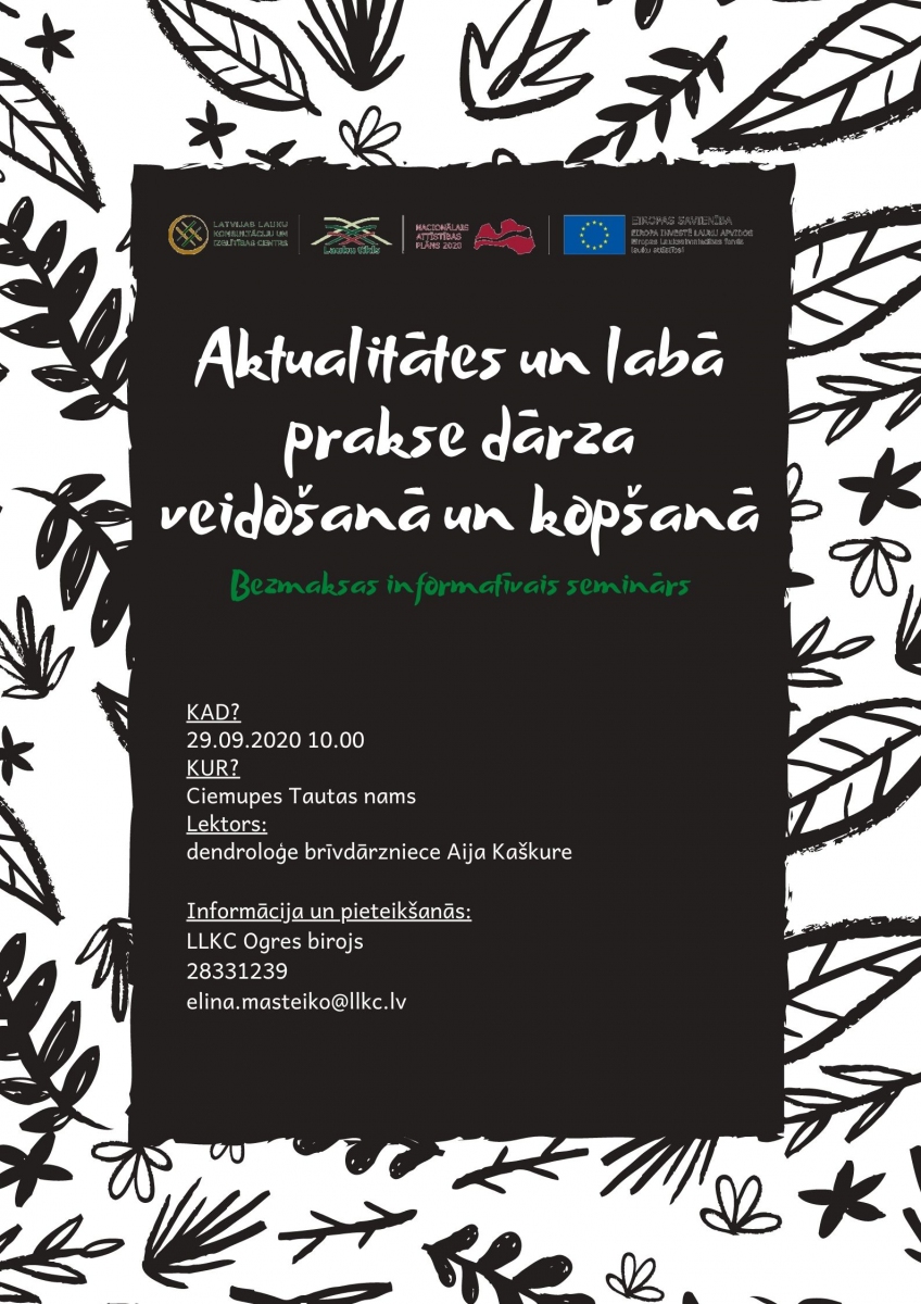 SIA LLKC Ogres birojs 29.09.2020 Ciemupes tautas namā 10:00 rīko informatīvu BEZMAKSAS semināru "Aktualitātes un labā prakse dārza veidošanā un kopšanā". Pārbaudītas vērtības, aktualitātes un jaunākās tendences.