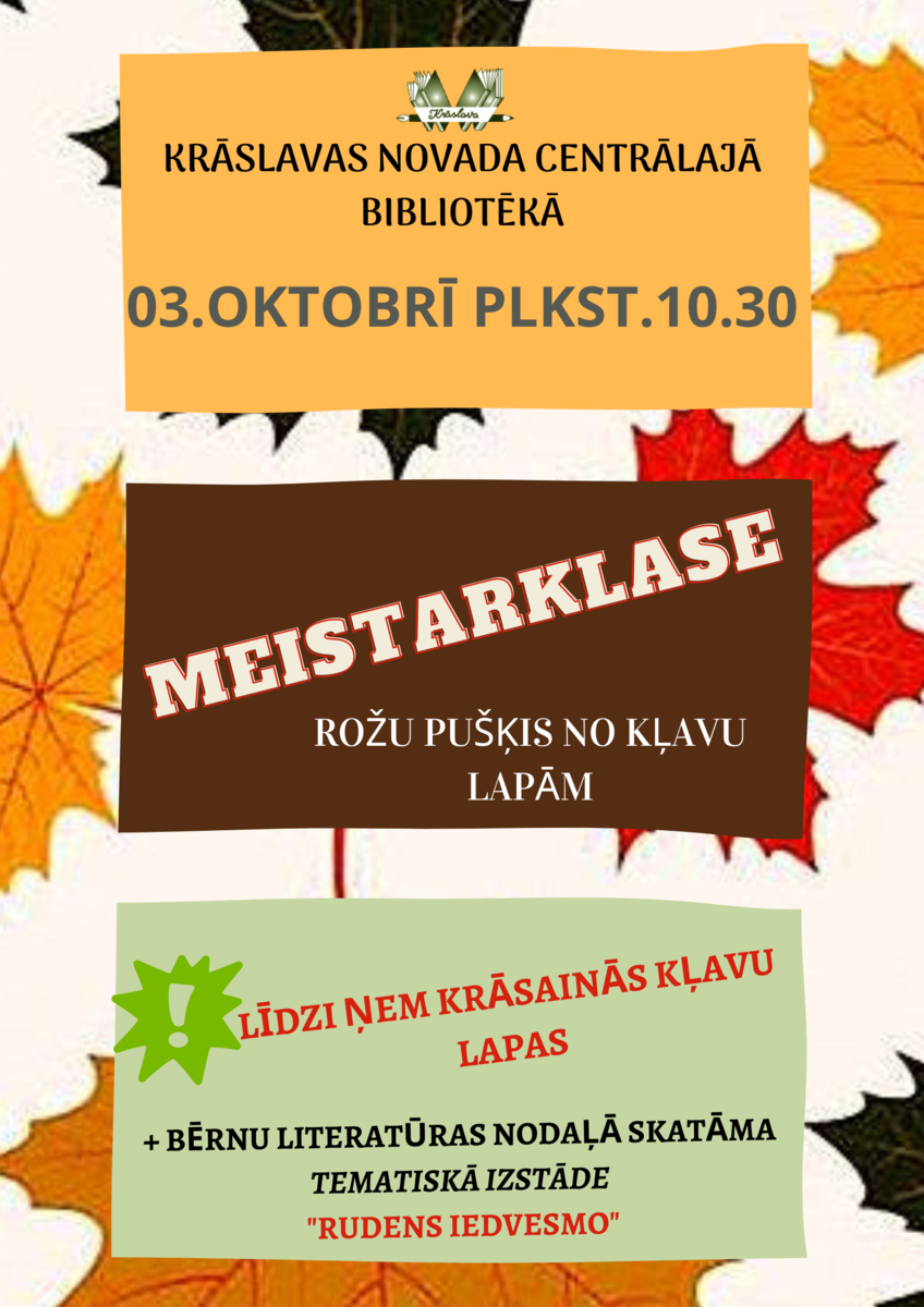 Krāslavas novada centrālajā bibliotēkā tiks organizēta meistarklase "Rožu pušķis no kļavu lapām"'. Līdzi jāņem krāsainās kļavu lapas.