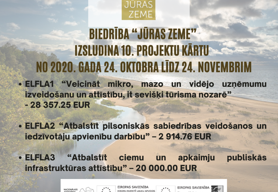 Vēl līdz 24.11.2020. ir iespēja iesniegt savu ieceru projektu pieteikumus Saulkrastu un Carnikavas novadu interesentiem VRG 'Jūras zeme' organizētā LEADER projektu konkursā.