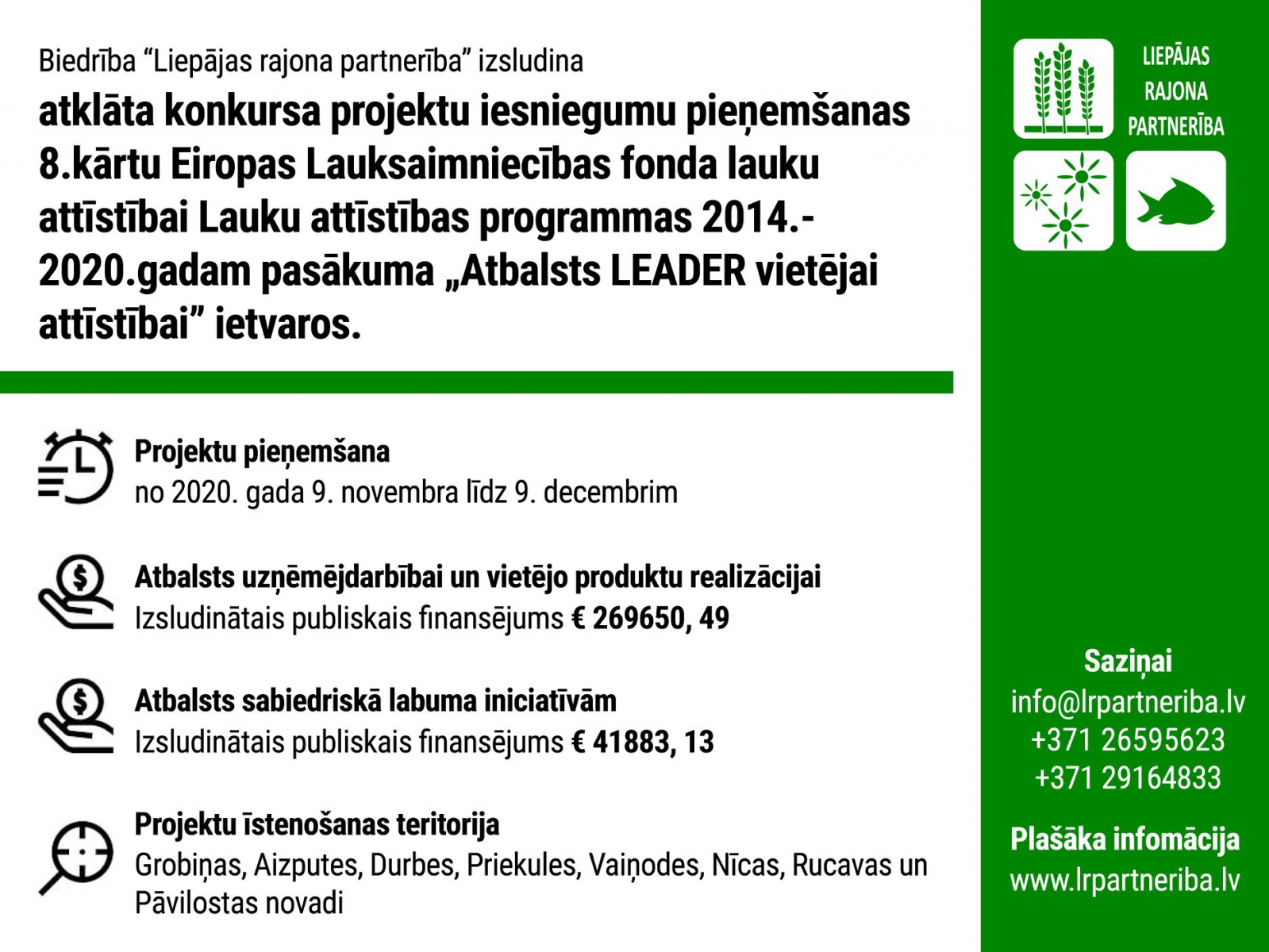 Biedrība “Liepājas rajona partnerība” izsludina atklāta konkursa projektu iesniegumu pieņemšanas 8. kārtu Eiropas Lauksaimniecības fonda lauku attīstībai Lauku attīstības programmas 2014.- 2020.gadam pasākuma „Atbalsts LEADER vietējai attīstībai” ietvaros.