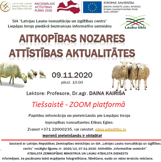 Papildus informācija pie LLKC Liepājas biroja lopkopības konsultantes Elīnas Egles (zvanot +371 22000235, vai rakstot: elina.egle@llkc.lv).