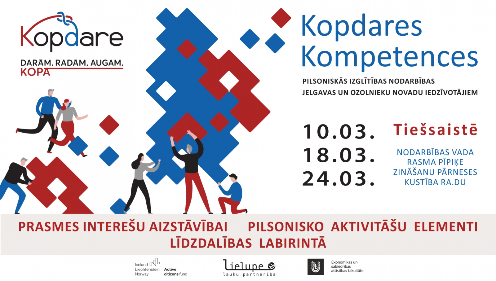 Pirmo reizi Jelgavas un Ozolnieku novadu iedzīvotājiem tiks sniegta iespēja piedalīties trīs dienu mācībās par līdzdalību savas kopienas veidošanā. Aicinām ikvienu šo novadu iedzīvotāju, tai skaitā jauniešus, seniorus, pašvaldību darbiniekus, nevalstisko organizāciju pārstāvjus, uzņēmējus piedalīties šajā praktiskajās un piesātinātajās mācībās.