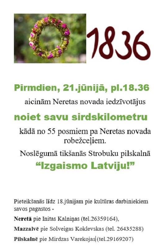Pirmdien, 21. jūnijā plkst. 18:36, Neretas novada iedzīvotāji tiek aicināti noiet savu sirdskilometru kādā no 55 posmiem pa Neretas novada robežceļiem.