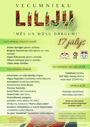 Savukārt Vecumnieku tautas namā tradicionāli būs skatāma lilijas ziedu izstāde, kurā aicinām piedalīties nesot lilijas ziedu uz Vecumnieku tautas namu 17. jūlijā no plkst. 10:00 – 12:00, iepriekš saskaņojot ierašanās laiku pa tālr. 28667825