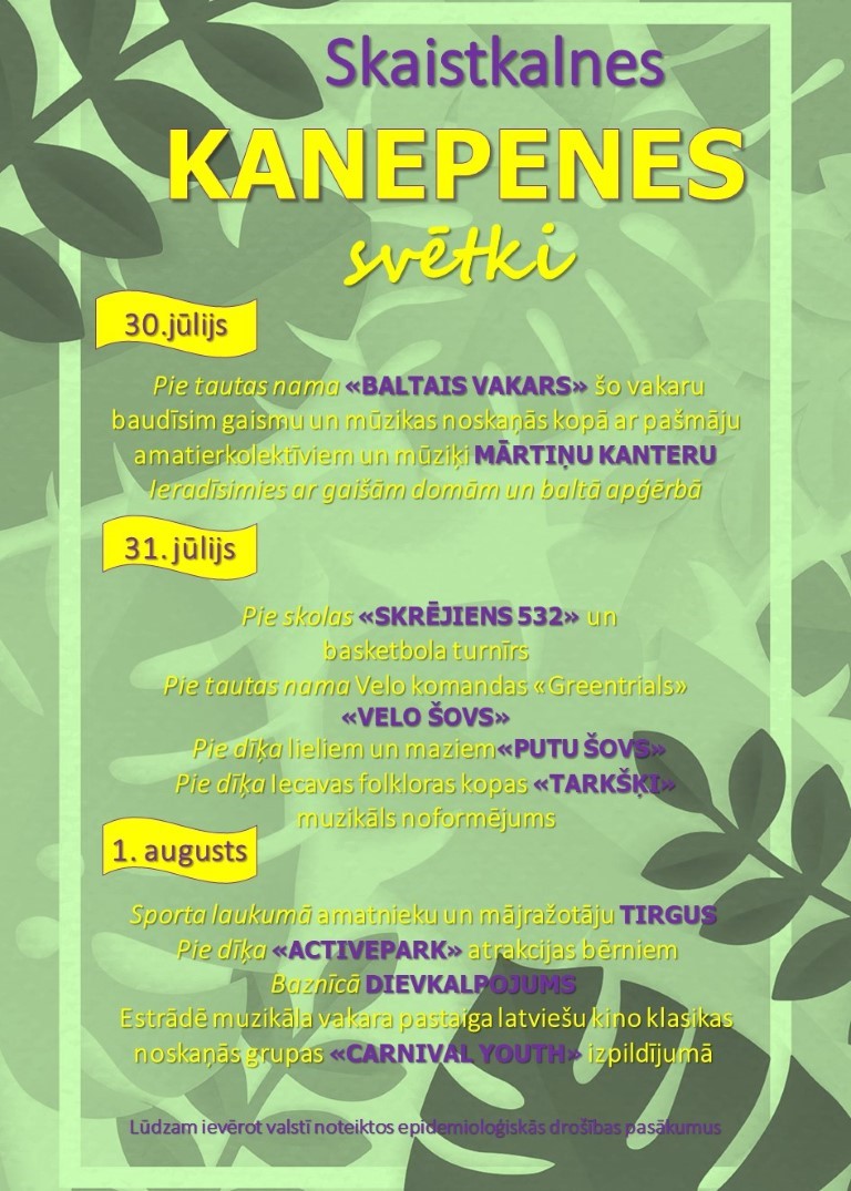 Lielais kanepenes gadatirgus mājražotājiem un amatniekiem notiks 1. augustā Skaistkalnes sporta laukumā. Būs arī atrakcijas bērniem "Active park". Skaistkalnes estrādē būs muzikālā vakara pastaiga Latviešu kino klasikas noskaņās grupas "Carnival Youth" izpildījumā.