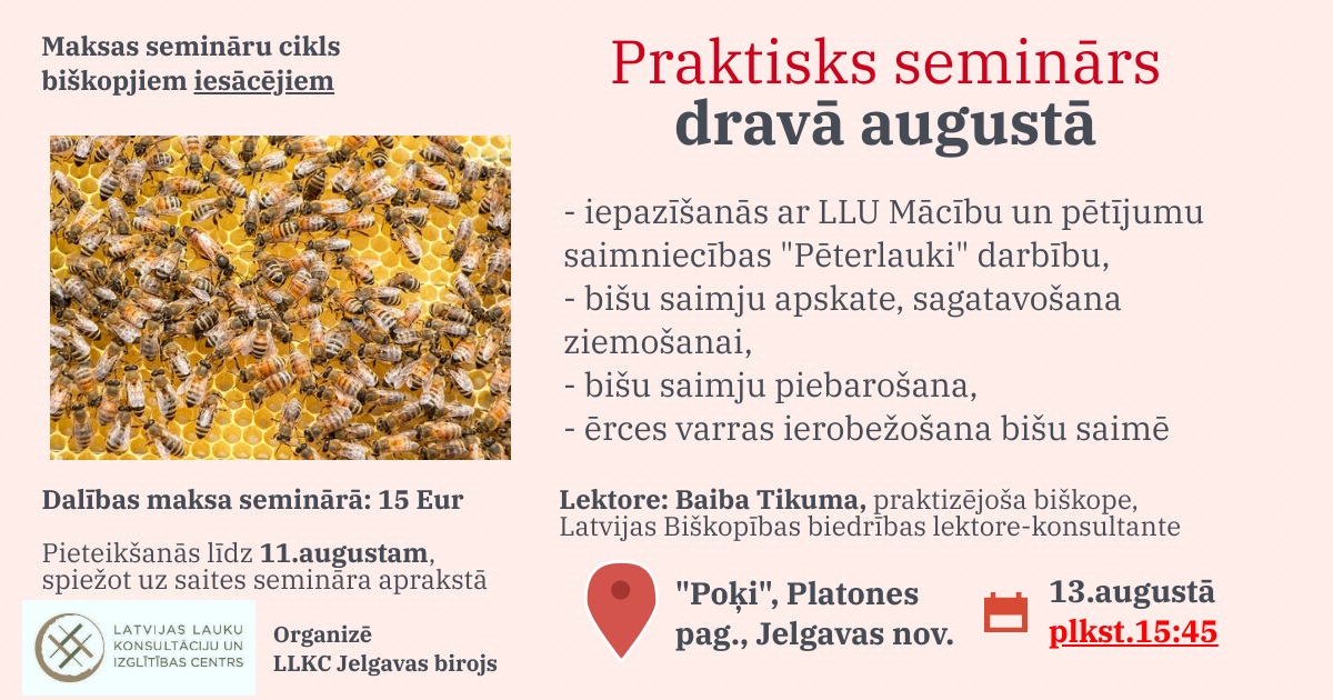 LLKC Jelgavas konsultāciju birojs aicina uz praktisku semināru biškopjiem iesācējiem mācību dravā "Poķi", Platonē, Jelgavas novadā 13.augustā plkst. 15:45.