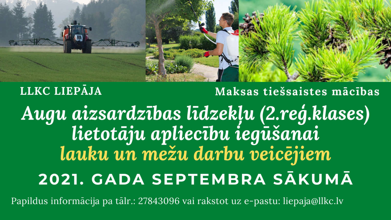 2021. gada septembra sākumā plānojam maksas tiešsaistes apmācības AUGU AIZSARDZĪBAS LĪDZEKĻU (2.REĢ.KLASES) LIETOTĀJU APLIECĪBU IEGŪŠANAI LAUKU UN MEŽU DARBU VEICĒJIEM.