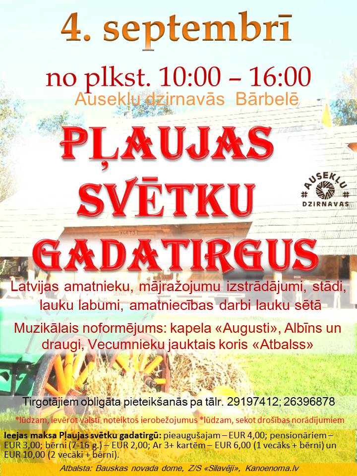 Ausekļu dzirnavās notiks ikgadējie pļaujas svētki un gadatirgus. Pļaujas svētki notiks 4. Septembrī no plkst 10:00 līdz 16:00, Bauskas novadā, Bārbeles pagastā, “Ausekļu dzirnavās”.