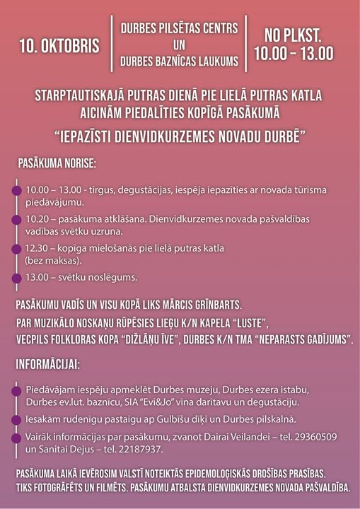 2021. gada 10. oktobrī no plkst. 10.00 līdz 13.00 Durbes pilsētas centrā un Durbes baznīcas laukumā starptautiskā putras dienā pie lielā putras katla ainām piedalīties kopīgā pasākumā "IEPAZĪSTI DIENVIDKURZEMES NOVADU DURBĒ".