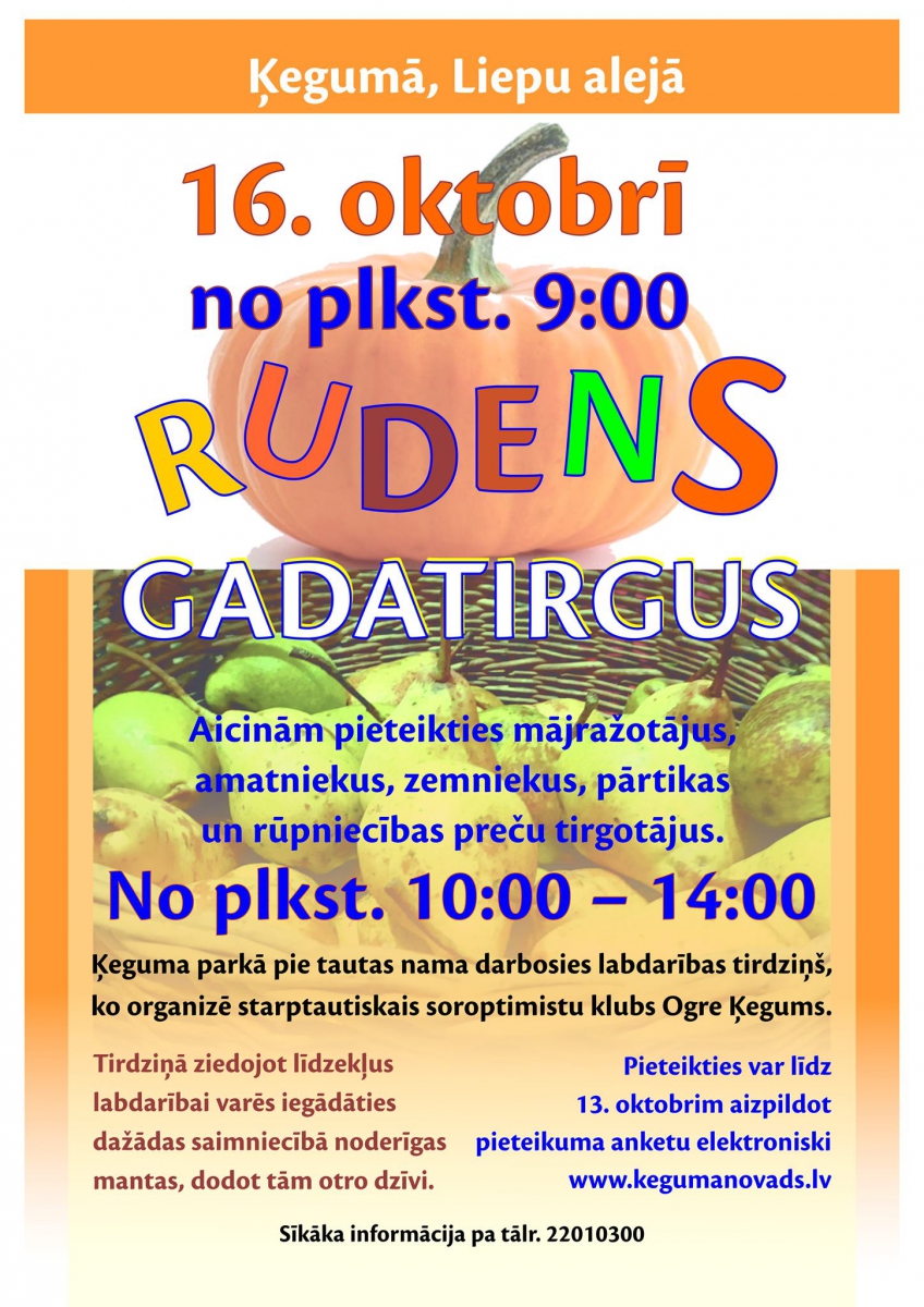 Ķegumā, Liepu alejā, 16.oktobrī no plkst. 9.00 notiks “Rudens gadatirgus”.