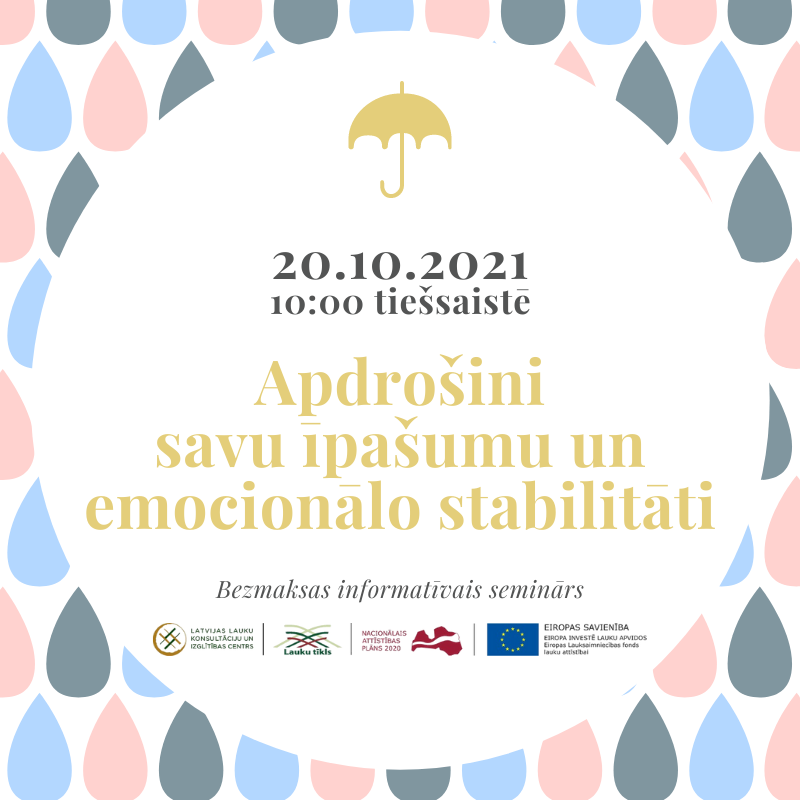 Kad ir lietaina diena, atceries, ka tikai lietainās dienās var ieraudzīt varavīksni. Šajā seminārā uzzināsi kā mēs – LLKC Ogres birojs – un tāpat arī apdrošināšanas polise varam Tev piedāvāt lietussargu šīm lietainajām dienām. Būs arī padomi emocionālās stabilitātes saglabāšanai, lai vienmēr pelēkajos mākoņos spētu saskatīt varavīksni.