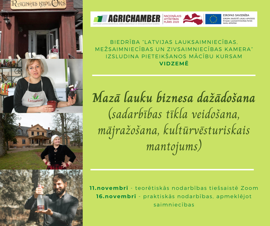 Biedrība “Latvijas lauksaimniecības, mežsaimniecības un zivsaimniecības kamera” izsludina pieteikšanos mācību kursam “Mazā lauku biznesa dažādošana (sadarbības tīkla veidošana, mājražošana, kultūrvēsturiskais mantojums)” Vidzemē.