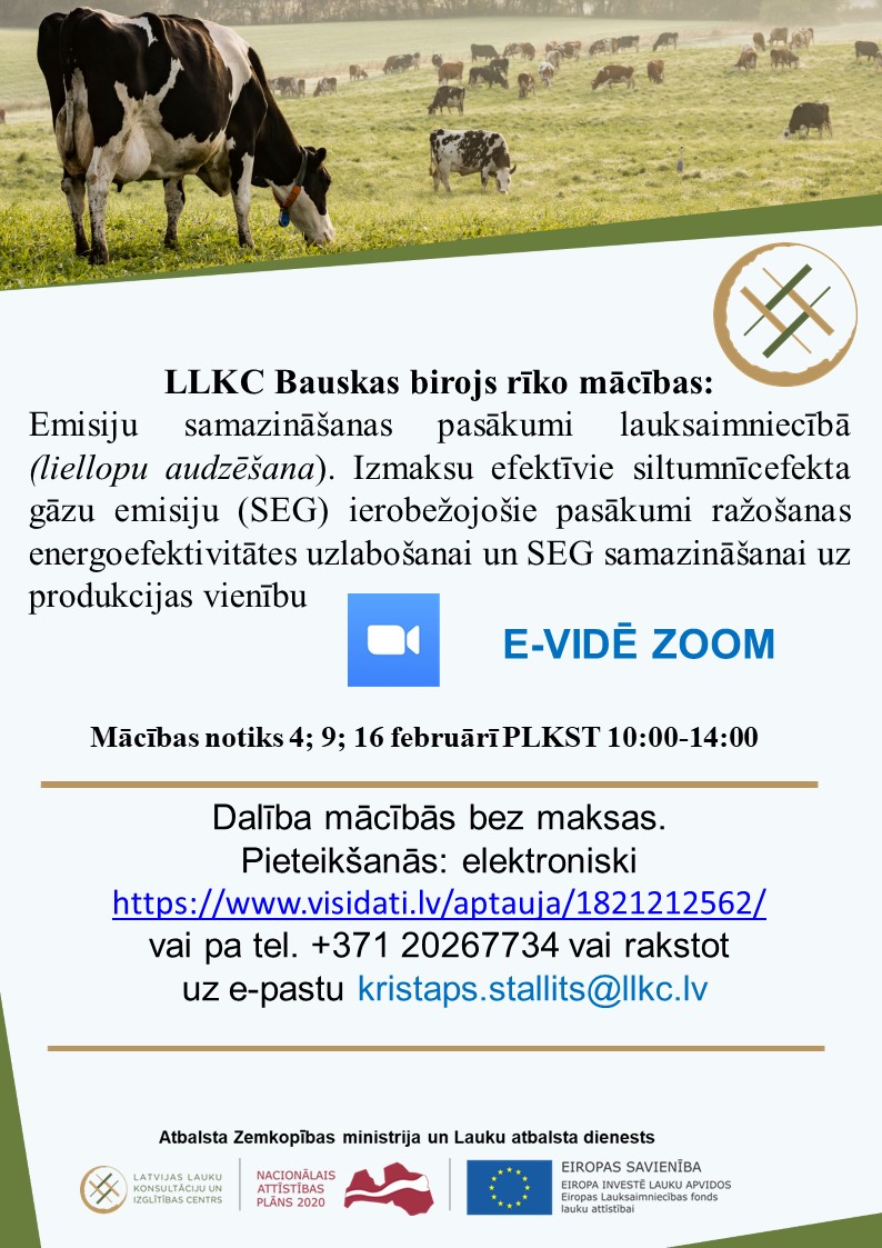 Latvijas Lauku konsultācijas un izglītības centra Bauskas birojs organizēs bezmaksas mācības: Emisiju samazināšanas pasākumi lauksaimniecībā (liellopu audzēšana). Izmaksu efektīvie siltumnīcefekta gāzu emisiju (SEG) ierobežojošie pasākumi ražošanas energoefektivitātes uzlabošanai un SEG samazināšanai uz produkcijas vienību