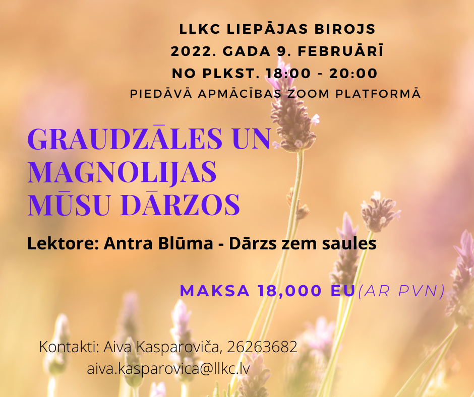 LLKC Liepājas birojs piedāvā 2022. gada 9. februārī maksas tiešsaistes mācības "GRAUDZĀLES UN MAGNOLIJAS MŪSU DĀRZOS".