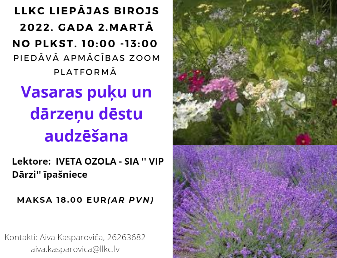 LLKC Liepājas birojs piedāvā 2022. gada 2. martā plkst. 10:00 maksas apmācības "VASARAS PUĶU UN DĀRZEŅU DĒSTU AUDZĒŠANA"(plānotais mācību ilgums ir līdz 3 stundām)*