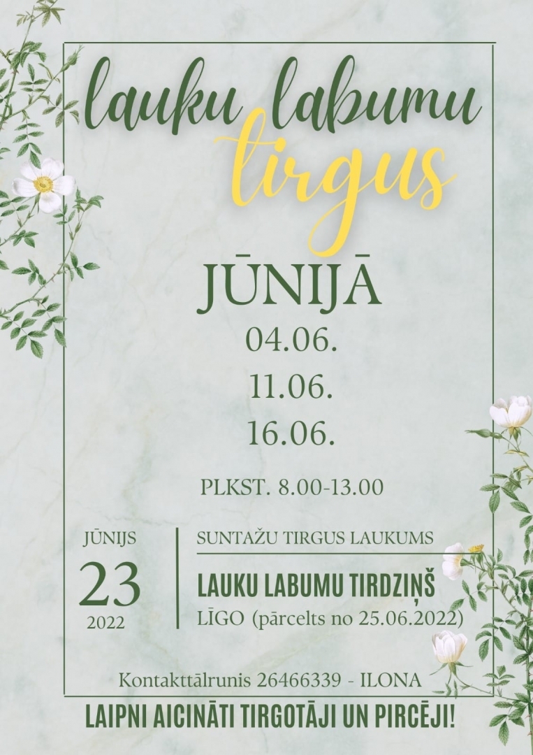 Lauku labumu tirgus Suntažos: 4., 11., 16. un 23. jūnijā no plkst.8.00 līdz 13.00.