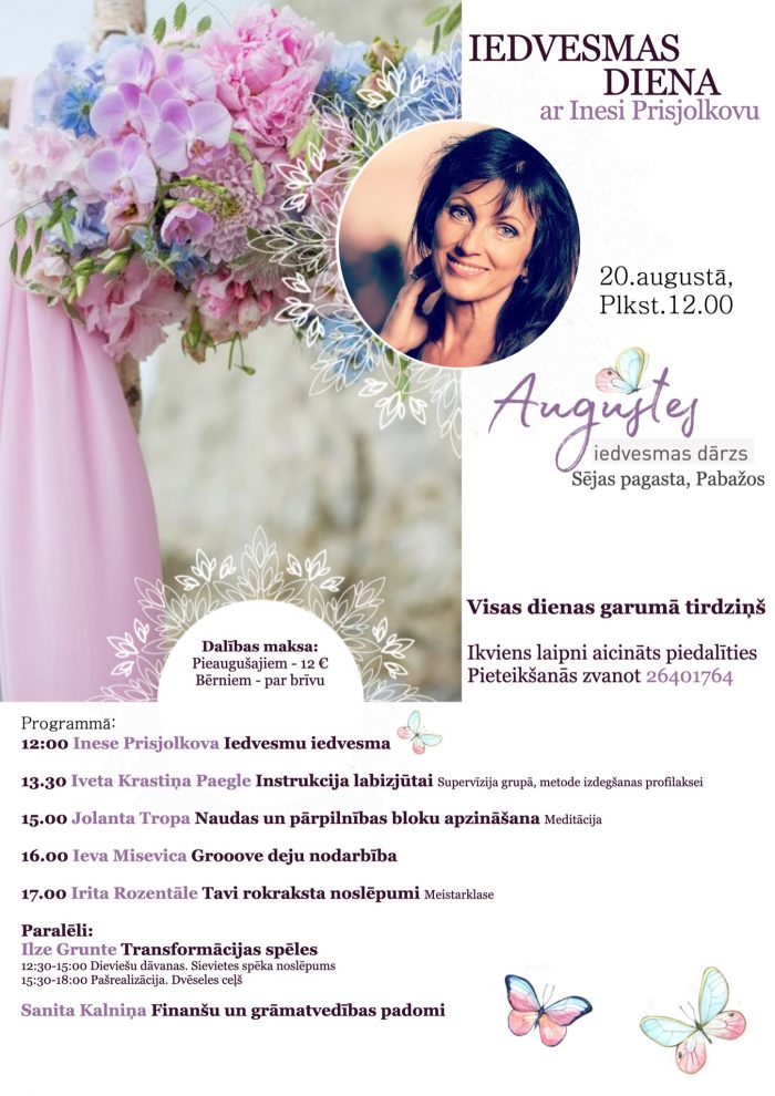 20.08.2022. 'Augustes iedvesmas dārzs' aicina apmeklētājus pavadīt dienu burvīgo hortenziju krāšņumā, papildināt krājumus mājražotāju un amatnieku tirdziņā, un piedalīties 'Iedvesmas dienas' meistarklasēs. Meistarklašu ietvaros I.Prisjalkovas un citu, garīgās iedvesmas meistaru darbnīcas.