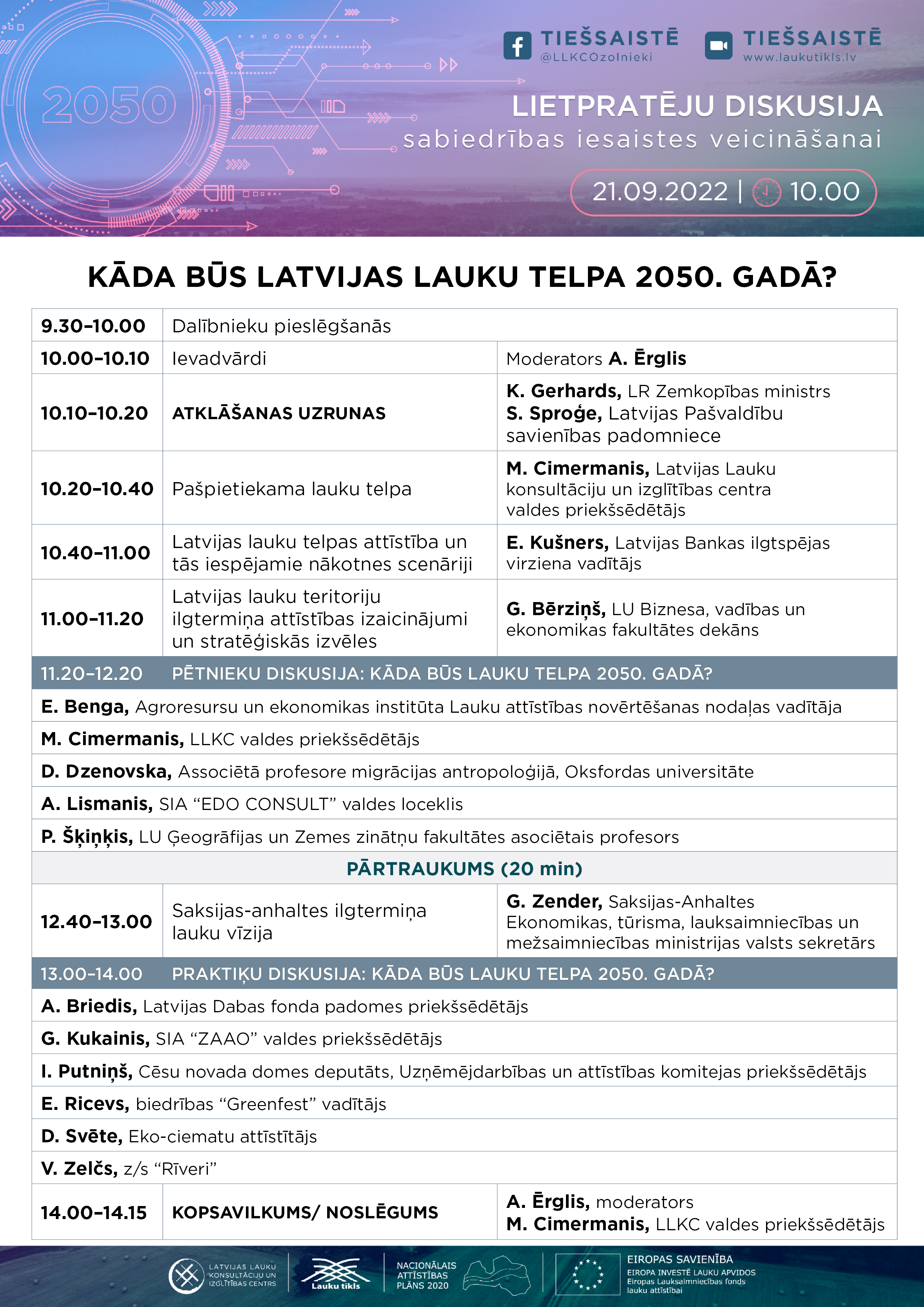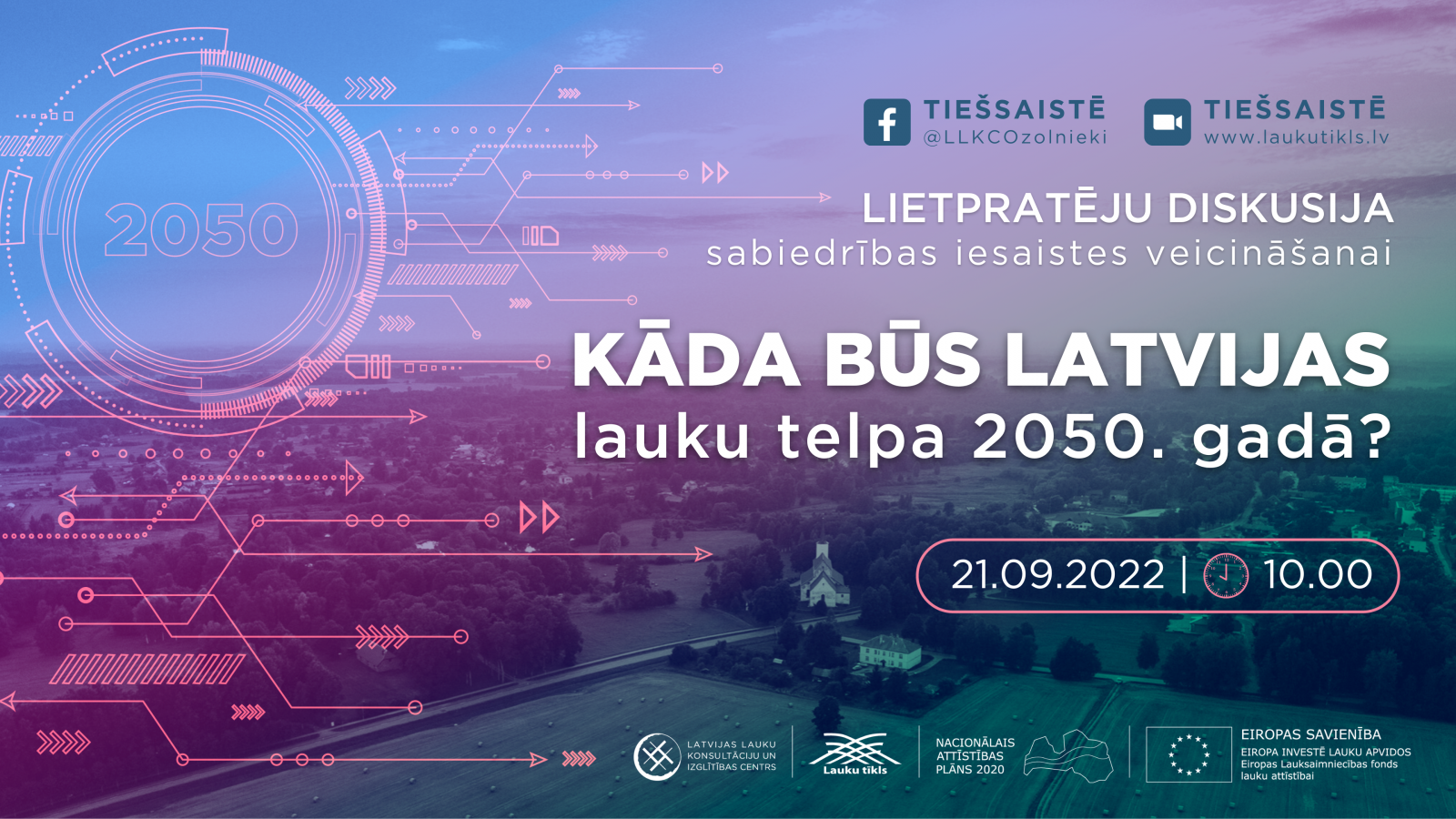 Aktīvākai sabiedrības iesaistei ceļā uz spēcīgiem, apdzīvotiem, izturētspējīgiem un pārtikušiem lauku apvidiem Latvijas Lauku konsultāciju un izglītības centrs (LLKC) aicina uz lietpratēju diskusiju “Kāda būs Latvijas lauku telpa 2050. gadā?”