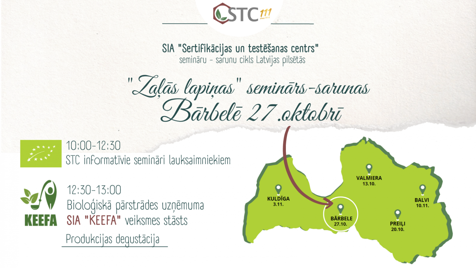SIA “Sertifikācijas un testēšanas centrs” (STC) aicina bioloģiskos lauksaimniekus uz bezmaksas informatīvo "Zaļās lapiņas" semināru 27.oktorbī, BĀRBELĒ, Barbeles tautas namā.