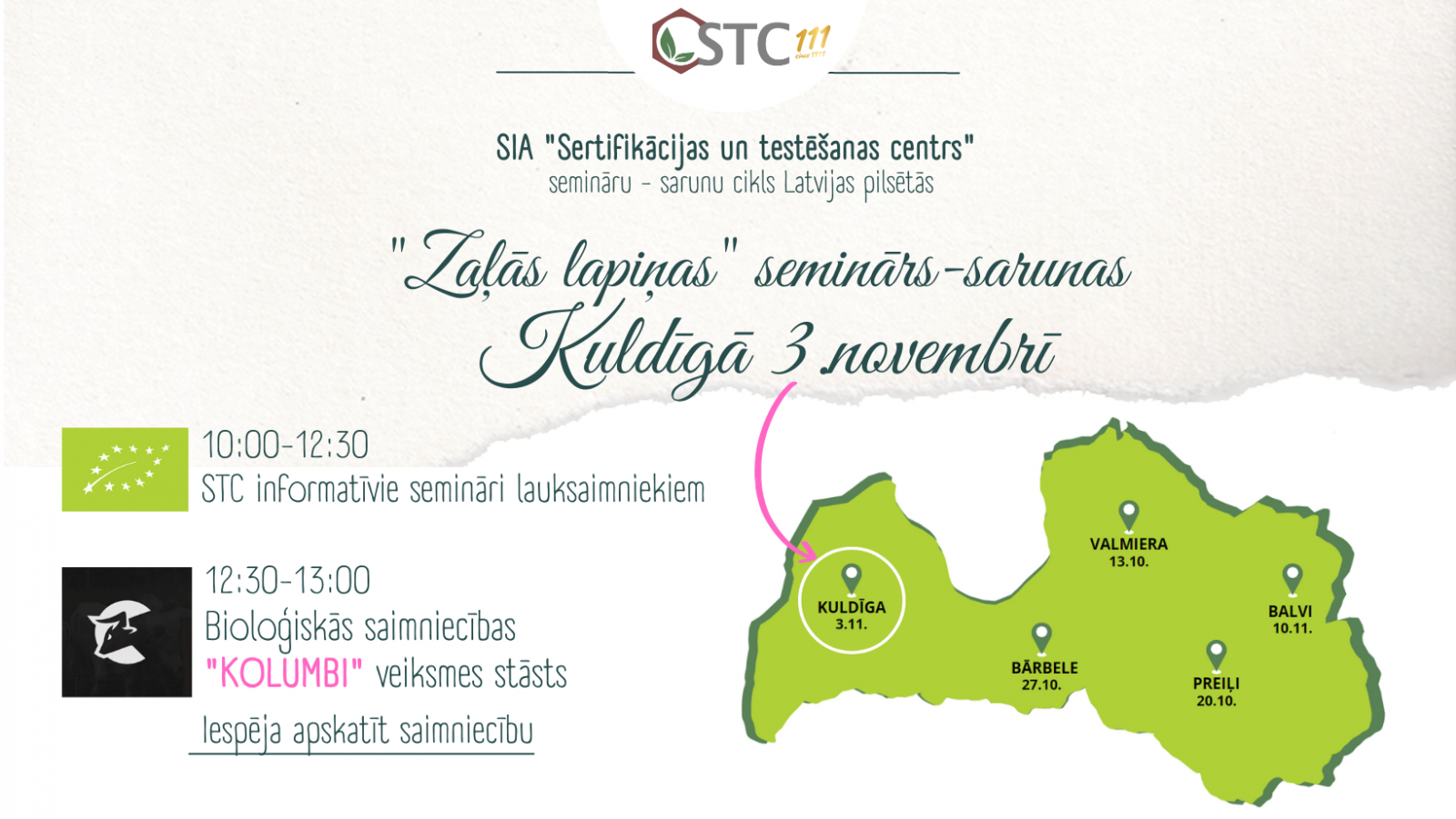 SIA “Sertifikācijas un testēšanas centrs” (STC) aicina bioloģiskos lauksaimniekus uz bezmaksas informatīvo "Zaļās lapiņas" semināru 3.novembrī, KULDĪGĀ, “Kolumbi”, Rumbas pag., Kuldīgas nov.