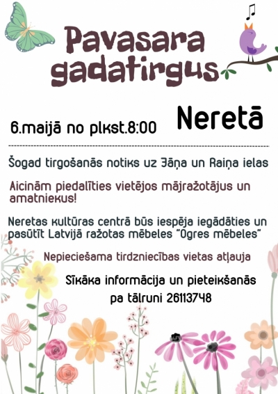 6. maijā no plkst. 8:00 aicina Nereta uz pavasara gadatirgu!