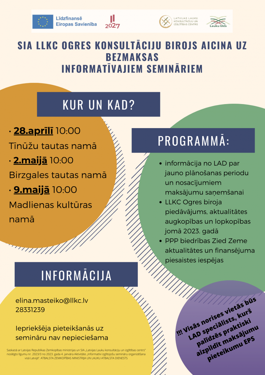 SIA LLKC Ogres birojs aicina lauksaimniekus un lauku uzņēmējus uz bezmaksas informatīvajiem semināriem "Aktuālā informācija lauku uzņēmējiem 2023. gadā"