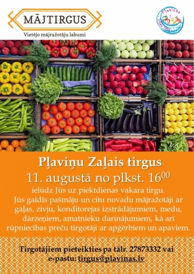Pļaviņu "Zaļais tirgus" 11. augustā no plkst. 16:00 ielūdz Jūs uz piektdienas vakara tirgu.