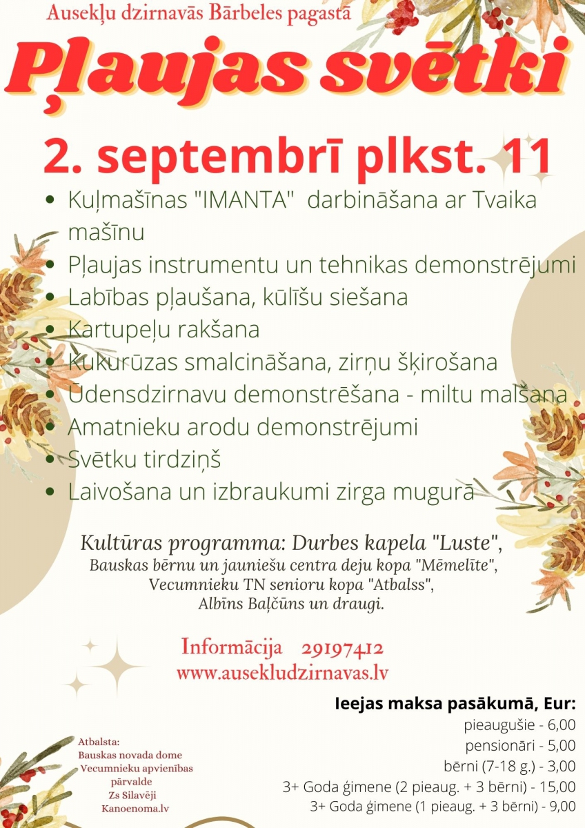 Rudens ir gadalaiks, kad dārzā, sētā un mājā darba pietiek visiem. Tāpēc rudens talkās tiek aicināti tuvāki un tālāki ļaudis, lai kopīgi paveiktu lielākus darbus. Ausekļu dzirnavu plašajā teritorijā “Pļaujas svētkos” varēs piedalīties dažādos lauku, mājsaimniecības un amatniecības darbos. Amatu meistari ļaus iepazīt muzejā esošo darbarīku pielietojumu un izzināt senču gudrības un darba tikumus.