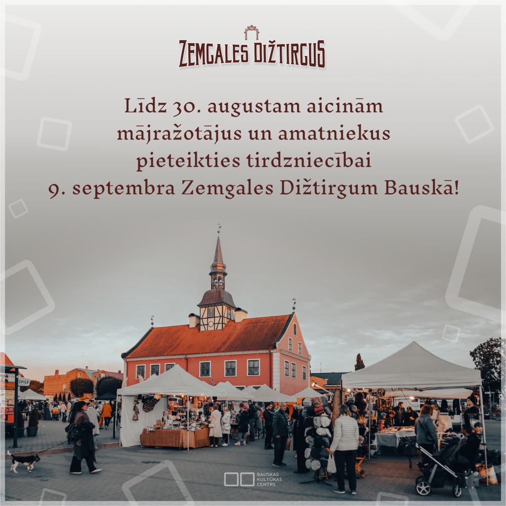 Aicinām amatniekus un mājražotājus pieteikties tirdzniecībai ikgadējā Zemgales Dižtirgū, kas jau visai tradicionāli otrajā septembra sestdienā, šogad 9. septembrī, norisināsies Bauskas Rātslaukumā no plkst. 17:00 līdz 00:00.