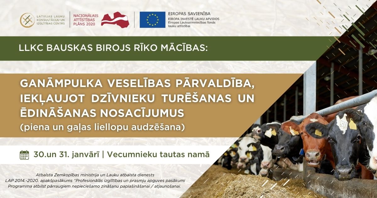 Aicinām pieteikties divu dienu mācībām “Ganāmpulka veselības pārvaldība, iekļaujot dzīvnieku turēšanas un ēdināšanas nosacījumus” (piena un gaļas liellopu audzēšana).