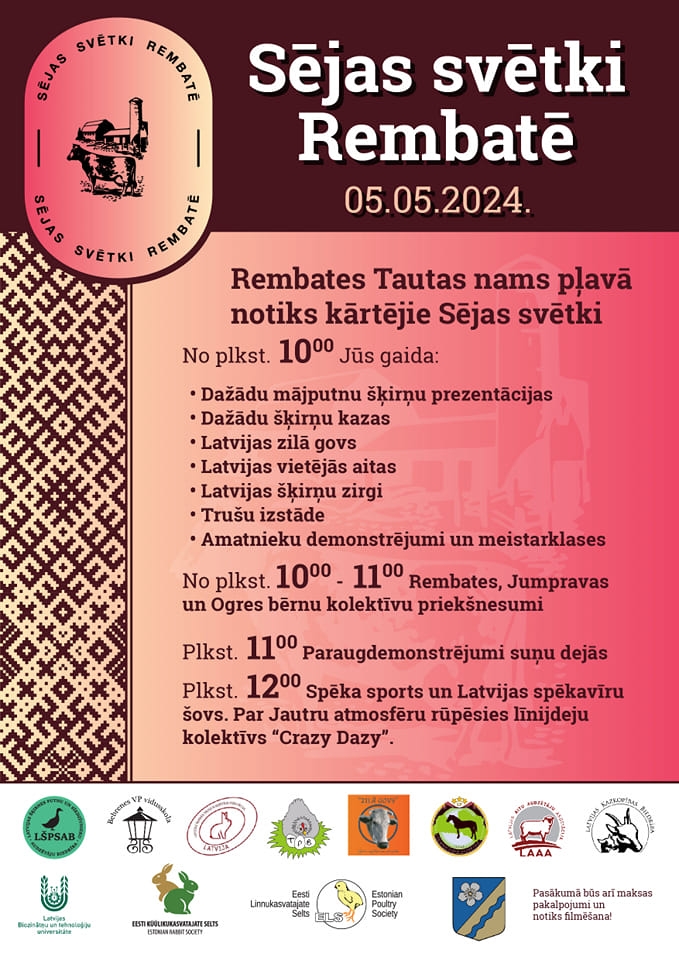 5.maijā no plkst.9.00 visas dienas garumā pļavā pie Rembates Tautas nama “Sējas svētki Rembatē”, kurus ieskandinās jautra mūzika un danči, lauku sētas iemītnieki, gardi ēdieni, dzērieni un daudz kas interesants un aizraujošs.