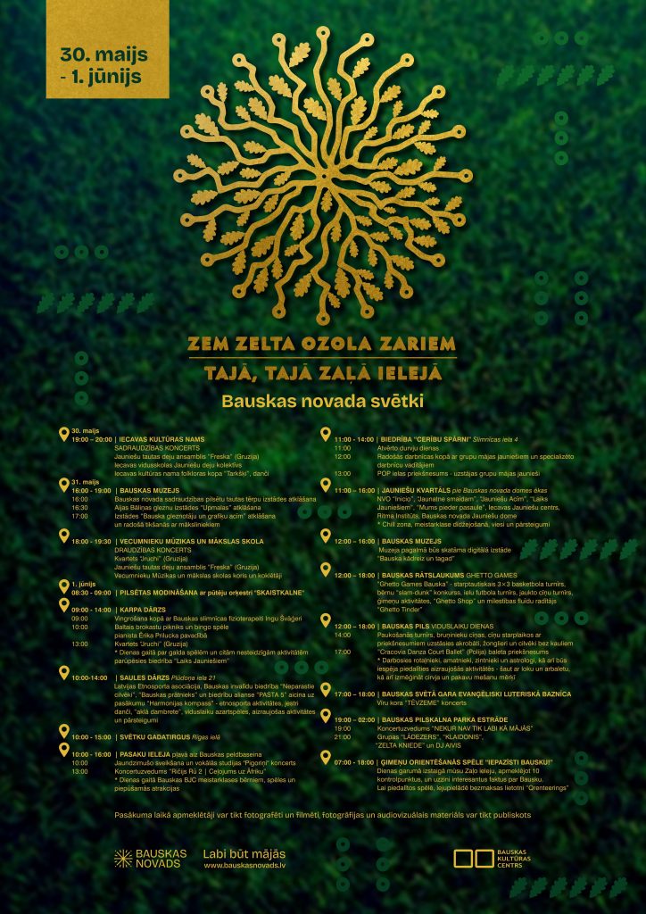 Šogad Bauskas novada svētki “Zem zelta ozola zariem” notiks 1. jūnijā un tie būs veltīti Bauskas pilsētas 415 gadu jubilejai, kad vairākās vietās pilsētā atbalsosies mūsu Zaļās ielejas stāsts, kas šoreiz iedvesmots no Edvīna Zariņa dziesmas “Dzelteni aizkari”, jo tā Bauskas puses iedzīvotāju vidū kļuvusi par iemīļotu melodiju. Svētku diena sāksies, baušķeniekus modinot kopā ar pūtēju orķestri “Skaistkalne” (diriģents Jānis Kalniņš), bet turpināsies ar “Ghetto Games Bauska”, Ričija Rū koncertu, orientēšanās spēli “Iepazīsti Bausku!” un citām norisēm dažādos pilsētas skvēros un laukumos. Svētku noslēgumā apmeklētāji aicināti būt kopā Bauskas Pilskalna parkā, kur notiks koncertuzvedums “Nekur nav tik labi kā mājās” (režisors Intars Rešetins – Pētersons), kā arī dziesmas un dejas kopā ar grupām “Lādezers”, “Klaidonis” un “Zelta kniede”.