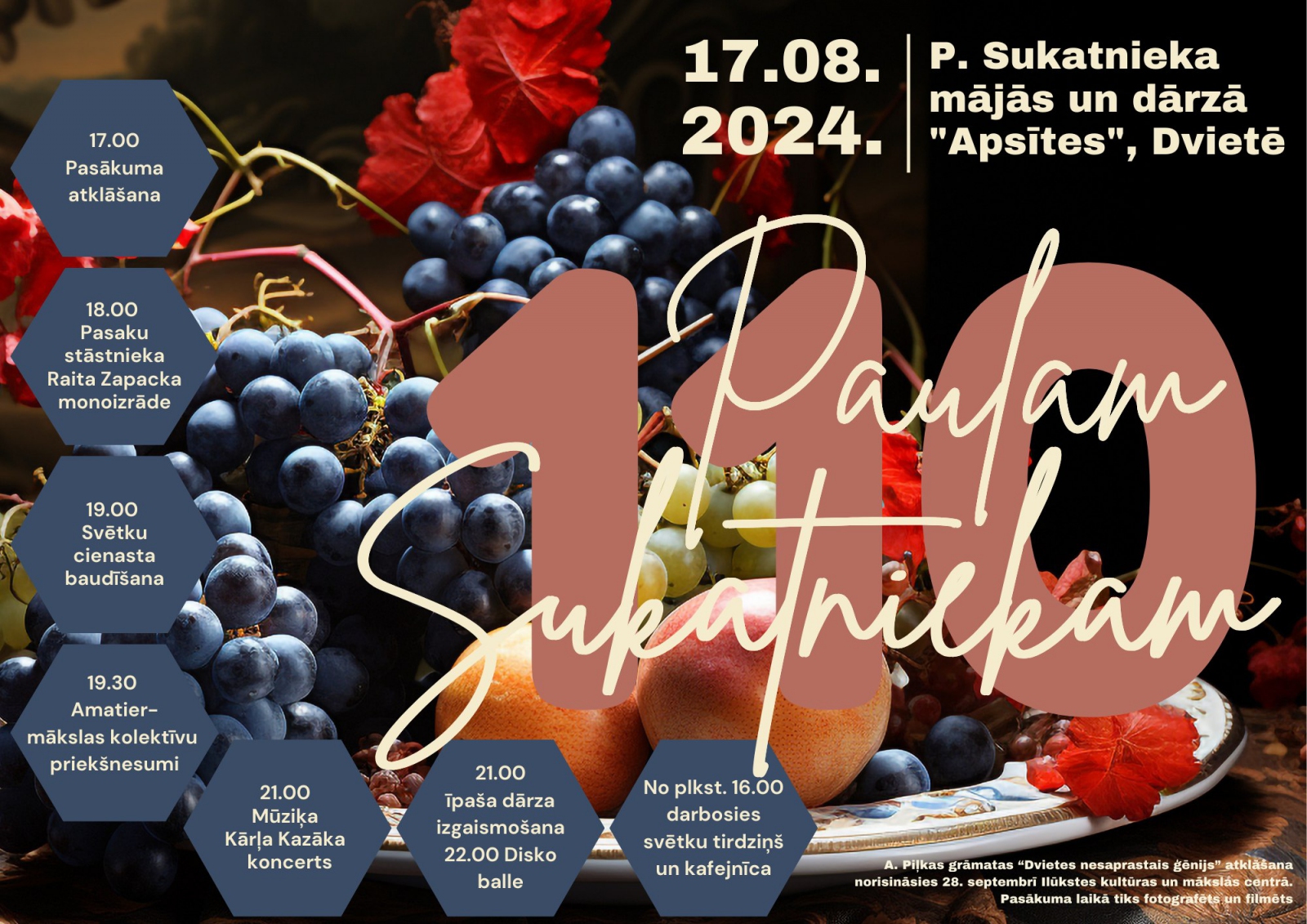 Godinot dvietieti, Latvijas vīnogu selekcionāru Paulu Sukatnieku, 2024. gada 17. augustā no 17.00 tiks atzīmēta viņa 110. dzimšanas diena. Svētku norises vieta – Paula Sukatnieka “Apsītes”, kurās dzīvojis un strādājis slavenais dārzkopis.