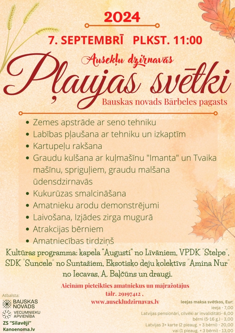 Plkst. 11:30 – 12:30 – demonstrējumu lauks (labības pļaušana ar izkaptīm un traktora vilkmes kulīšu pļāvēju, kūlīšu siešana, saulespuķu un kukurūzas novākšana, kartupeļu rakšana, zemes aršana un citi zemes darbi);