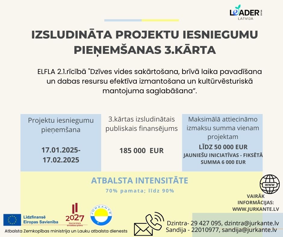 Vietējās rīcības grupas (VRG) kontaktinformācija: www.jurkante.lv; dzintra@jurkante.lv