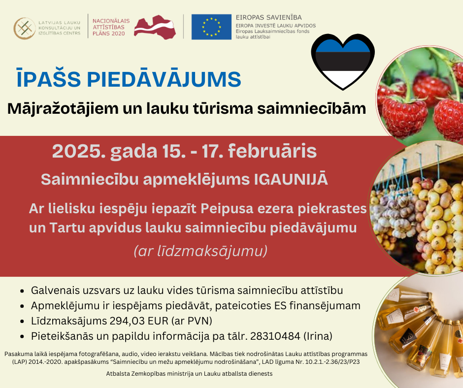 LLKC Liepājas birojs piedāvā lielisku iespēju iepazīt Igaunijas Peipusa ezera piekrastes un Tartu apvidus lauku saimniecību piedāvājumu no 2025. gada 15. līdz 17. februārim.