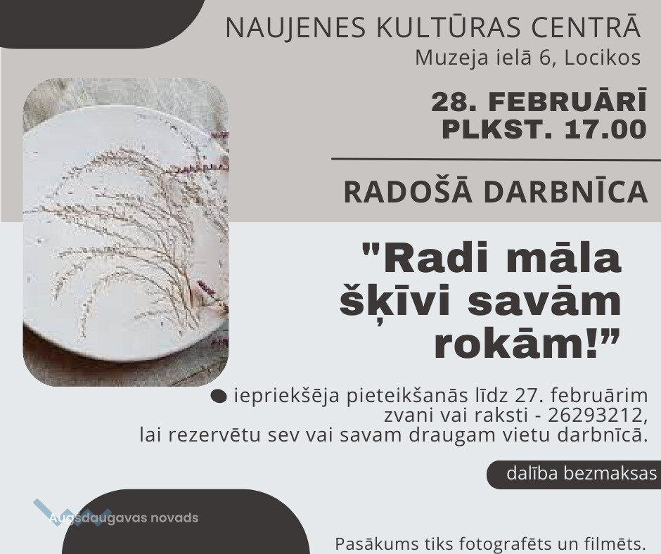 28.02.2025. plkst.: 17.00, Naujenes kultūras centrā "Radi māla šķīvi savām rokām!"