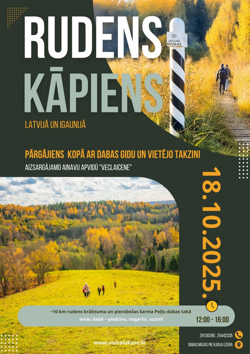 RUDENS KĀPIENS jeb pārgājiens ar skatu uz divām valstīm, ko organizē Alūksnes Tūrisma informācijas centrs, lai sajustu divu valstu klātbūtni un redzētu, kā izskatās rudens Latvijā,- pakāpjoties Igaunijā. Tas būs piedzīvojums, kurā dabas izziņa savīsies ar fizisku kustību un kopības sajūtu, dodoties apmēram 10 kilometru garā maršrutā pa Peļļu dabas taku, kopā ar ornitologu un dabas gidu Elviju Kantānu, un vietējo takzini un stāstnieku Jāni Prangeli. Sīkāka informācija saitē: https://visitaluksne.lv/rudens-kapiens/