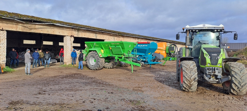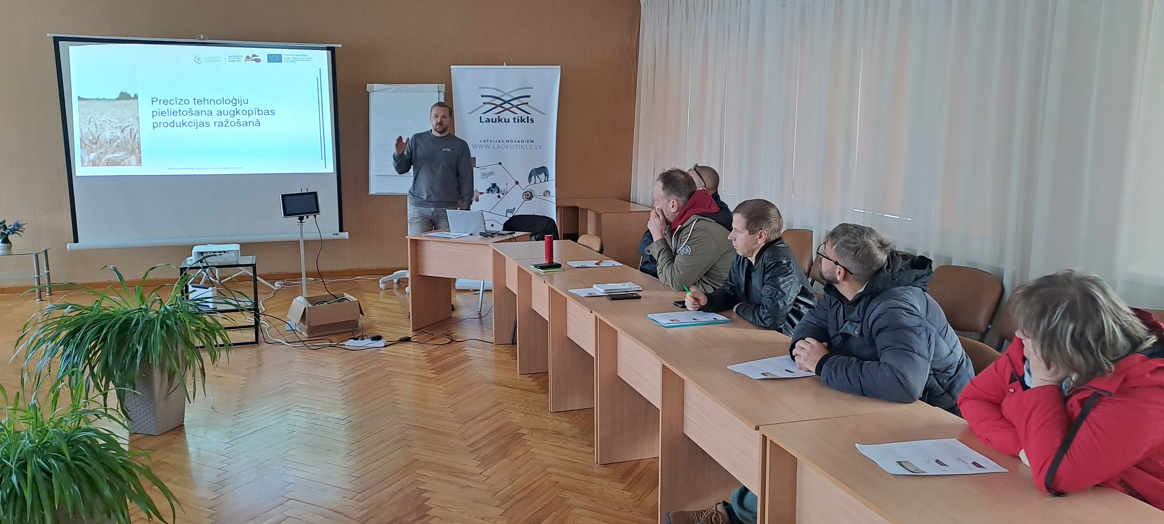 Pirmā diena bija produktīva ne vien ar teorētisko zināšanu apguvi, bet arī kā starts praktiskajām nodarbībām. Otrā mācību diena notika zemnieku saimniecībā “Līči”, kurā tiek izmantotas precīzās tehnoloģijas, dati apkopoti saimniecības pārvaldības sistēmā, veikta analīze gan agronomisko risinājumu uzlabošanā, gan investīciju piesaistē, apsaimniekojot vairāk nekā 800 ha lauksaimniecības zemes. Lektors Gatis Bērziņš kopā ar saimnieku Jāni Auziņu īsumā iepazīstināja ar saimniecības vēsturi, esošo situāciju, uzskaites sistēmām un digitālo rīku pielietošanu saimniecībā. Bija iespēja apskatīt un izmēģināt visas esošās precīzo tehnoloģiju iekārtas, kā arī uz ziemāju lauka veikt tā robežu iezīmēšanu tālāko darbību veikšanai. Atgriežoties telpās, dalībnieki veica praktiskus uzdevumus, balstoties uz abās dienās iegūtajām zināšanām.
