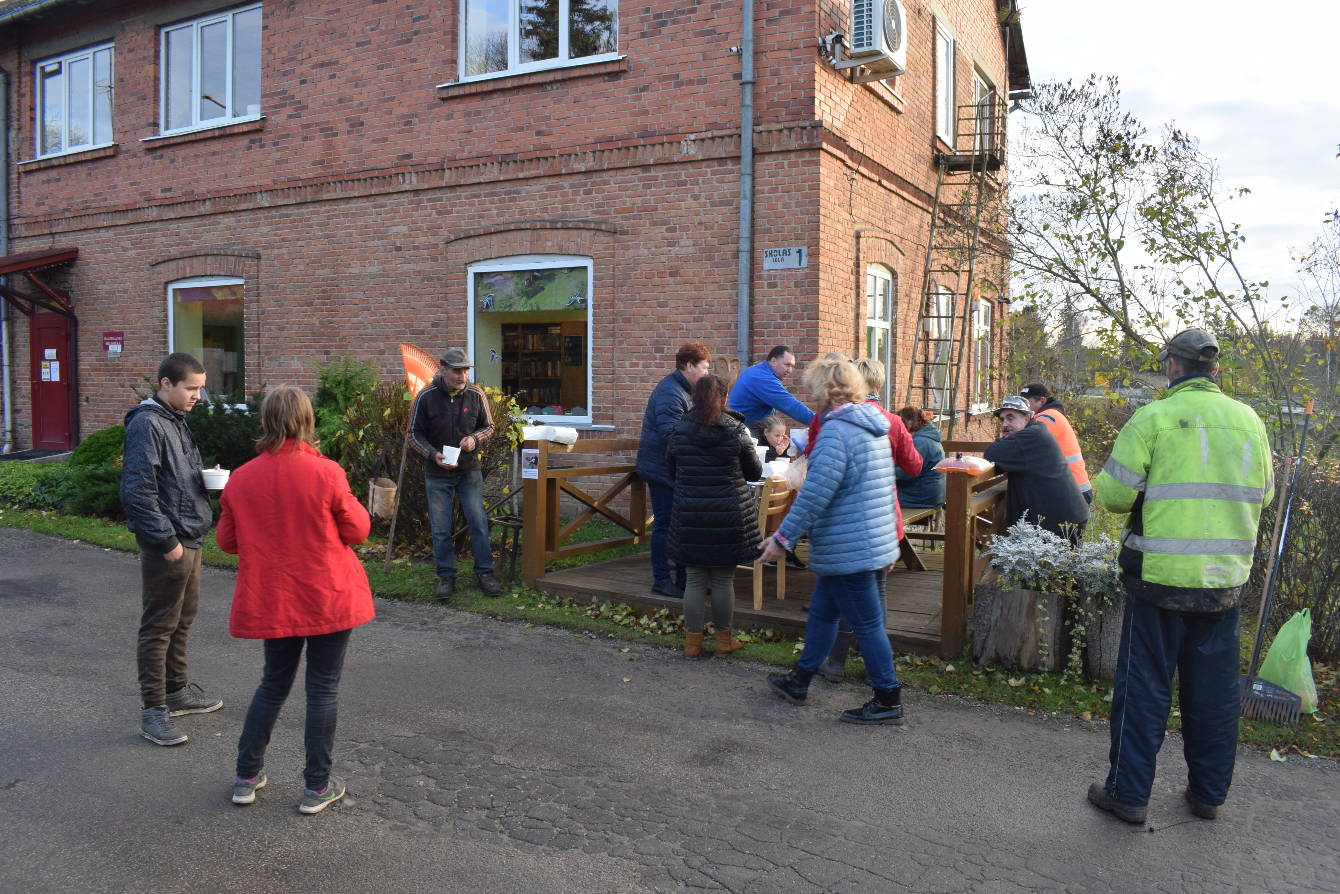 Ar zāģiem, cirvjiem, trimeriem un grābekļiem teritoriju no pagastmājas līdz apsei pirms vidusskolas ēkas sakopa Kurmenes un Skaistkalnes viedā ciema iniciatīvas grupas dalībnieki un domubiedri, pavisam 36 apņēmības pilni talcinieki.