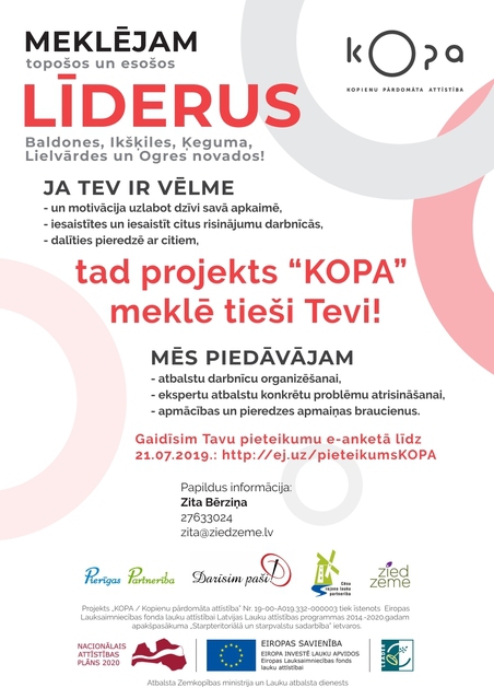 Līdz 21. jūlijam projekts “KOPA” aicina pieteikties esošos un topošos līderus, kuriem ir vēlme uzlabot dzīvi savā apkaimē un iesaistīties risinājumu darbnīcu organizēšanā. Līderi tiek meklēti Baldones, Ikšķiles, Ķeguma, Lielvārdes un Ogres novados!