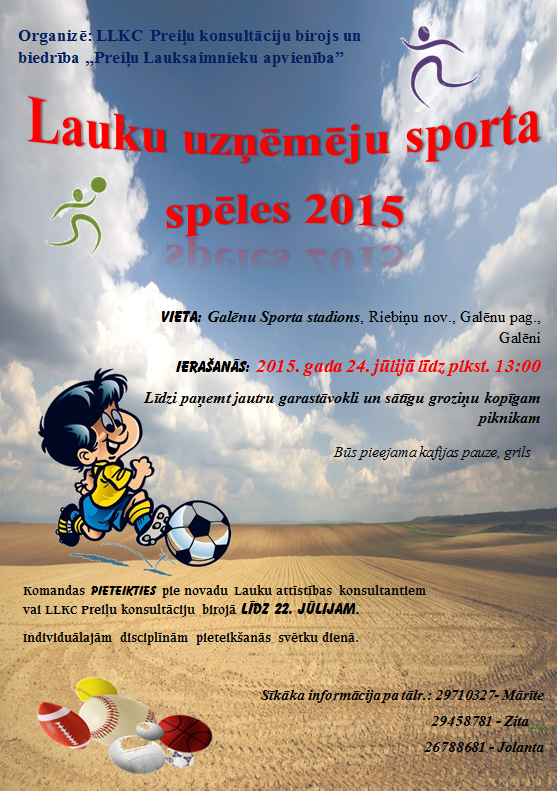 Vairāk informācijas sporta spēļu nolikumā. Pieteikšanās līdz 22. jūlijam pie novadu lauku attīstības konsultantiem vai LLKC Preiļu konsultāciju birojā.
