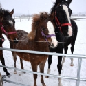 Starp majestātiskajiem zirgiem grūti nepamanīt augumā mazākos ponijus. Tīri vizuāli Velsas poniji nezinātājam ļoti atgādina miniatūrus zirdziņus – tie nav tik mazi un drukni kā Šetlandes sugasbrāļi, kuri parasti piedalās dažādos publiskos pasākumos. Viengadnieču kumeļmeiteņu pulkā draiskojas brūnā Adele May. Turpat blakus kumeļmāšu bariņā svaiga gaisa peldes bauda Adeles mamma Maijiņa, pilnā vārdā Reylem Mystic May. Citos zirgu pulkos ganās vēl divi poniju kumeļi. Bet pašā nomaļākajā aplokā uz sniega fona knapi saskatāms gaiši pelēkais ponijs – dzimtas tēvs Moravikens Malibu.
