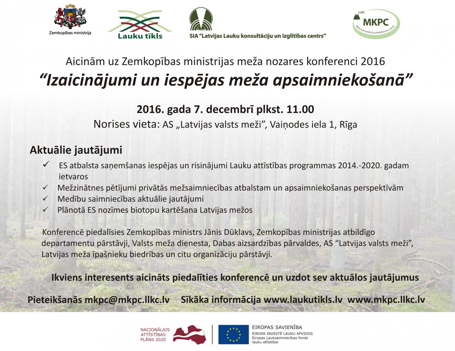 Konferencē piedalīsies Zemkopības ministrs Jānis Dūklavs, Zemkopības ministrijas atbildīgo departamentu pārstāvji, Valsts meža dienesta, Dabas aizsardzības pārvaldes, AS “Latvijas valsts meži”, Latvijas meža īpašnieku biedrības un citu organizāciju pārstāvji.