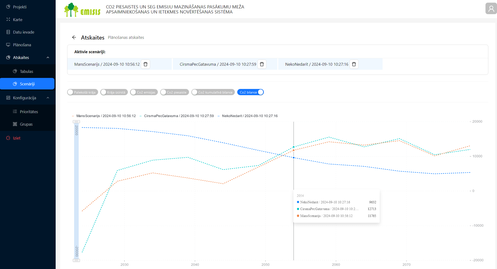 Variējot ar dažādiem meža apsaimniekošanas scenārijiem, koku ciršanas intensitāti un mērķtiecīgajiem oglekļa piesaistes pasākumiem, lietotājam ir iespējams noskaidrot sev vēlamāko meža apsaimniekošanas scenāriju un oglekļa piesaistes bilanci.