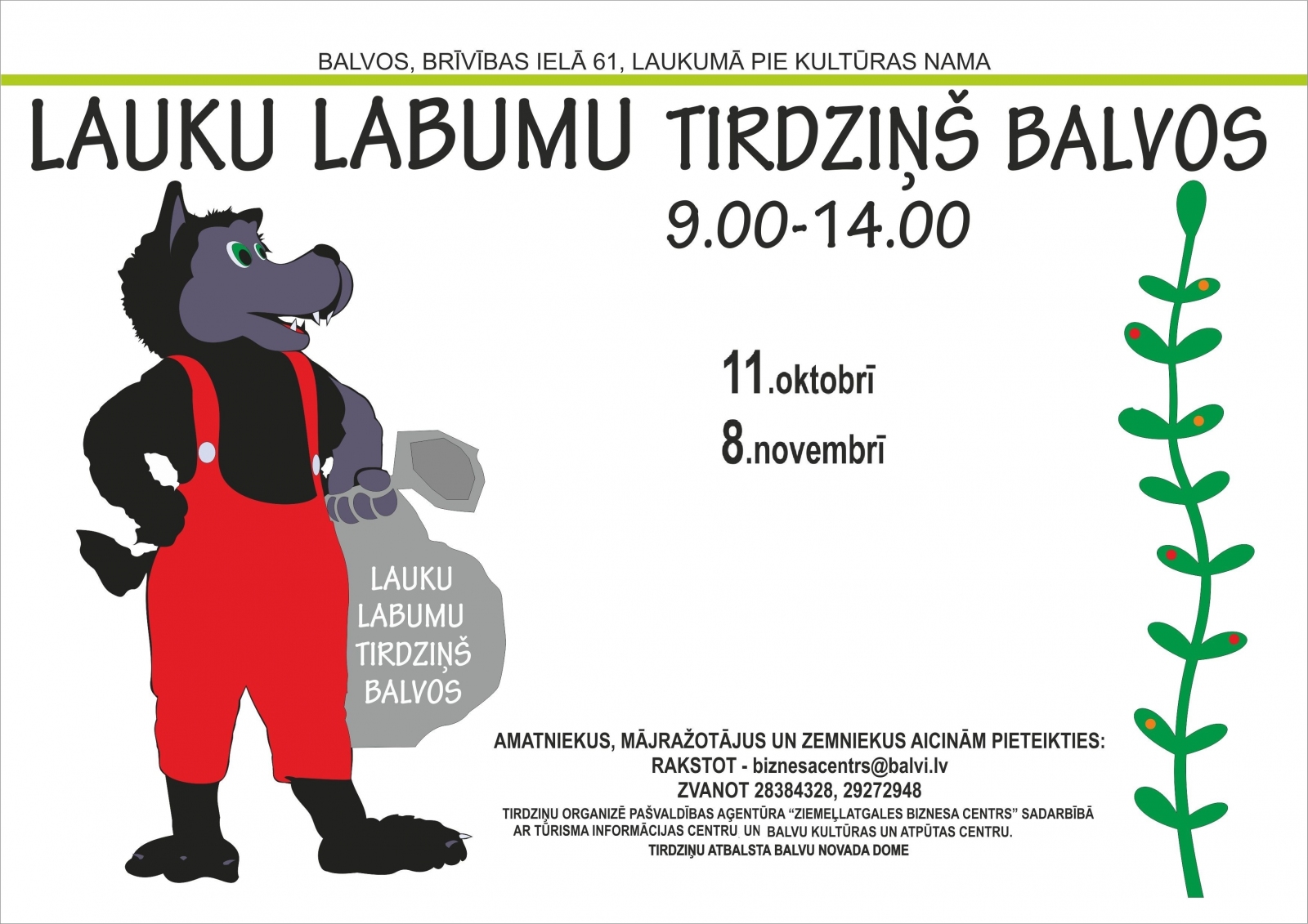 Piedalīties aicinām zemniekus, amatniekus un mājražotājus ar vietējā ražojuma produkciju! Iepriekšēja pieteikšanās dalībai tirdziņā obligāta (līdz 9.oktobrim) - Ziemeļlatgales Biznesa centrā: rakstot uz biznesacentrs@balvi.lv vai zvanot 29110896, 26461435; Tūrisma informācijas centrā: rakstot uz turisms@balvi.lv vai zvanot 29272948! Īpaši gaidām Balvu un tuvāko kaimiņu novadu zemniekus, mājražotājus, amatniekus ar savu ražoto preci, sezonas augļu un dārzeņu tirgotājus!