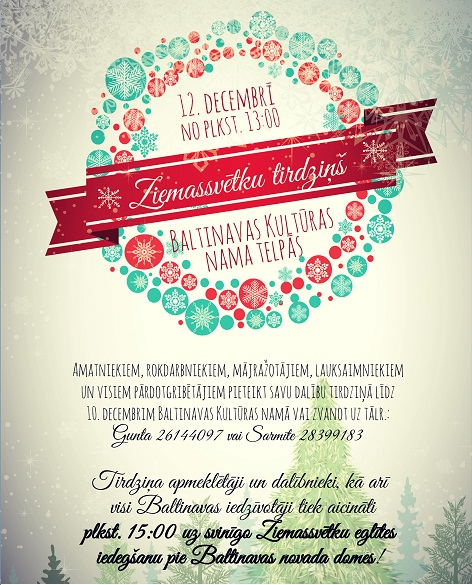 Ziemassvētku tirdziņš notiks 12.decembrī no plkst. 13:00 Baltinavas Kultūras nama telpās.