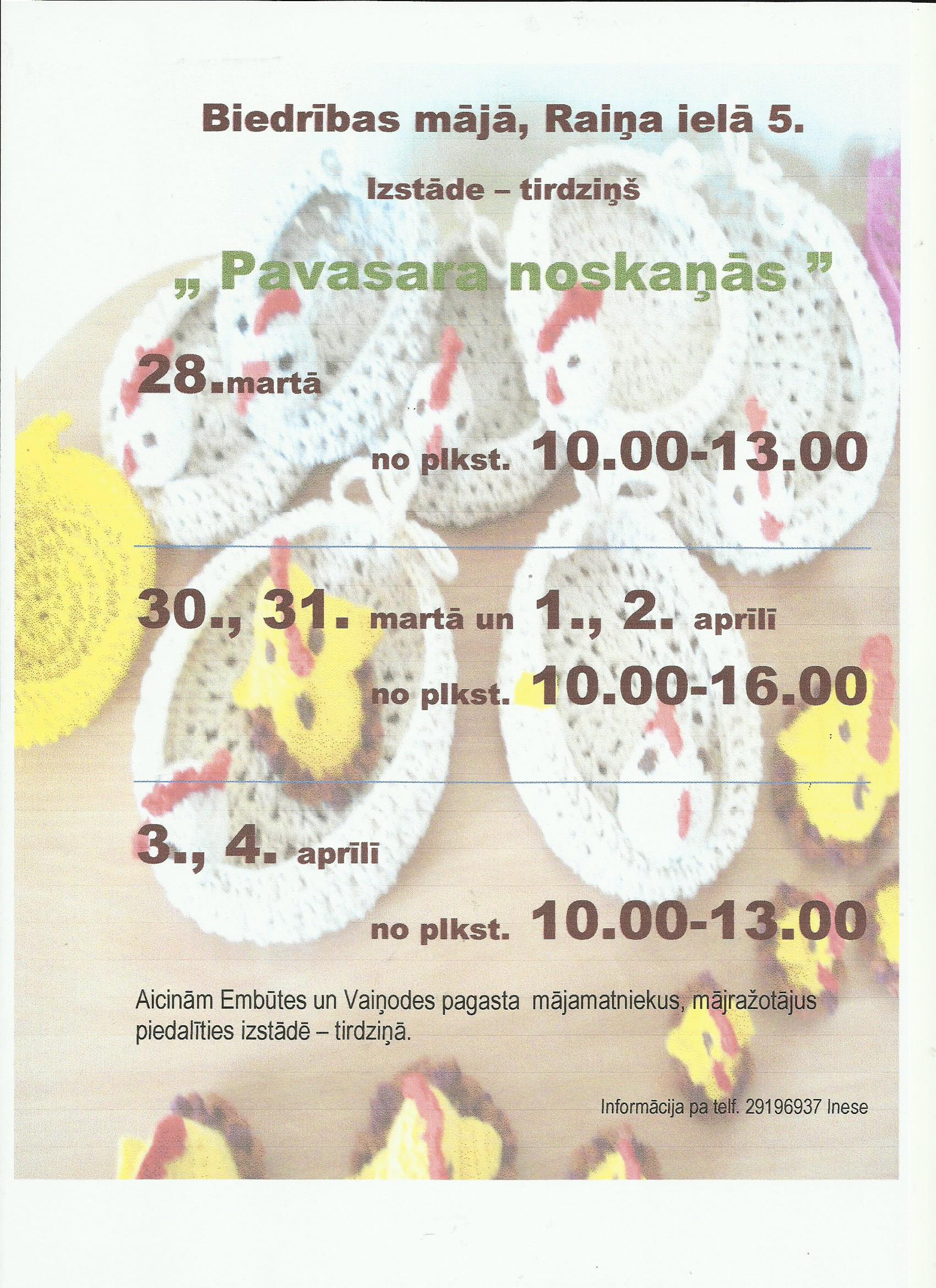 Aicinām Embūtes un Vaiņodes pagasta mājamatniekus, mājražotājus piedalīties izstādē – tirdziņā.