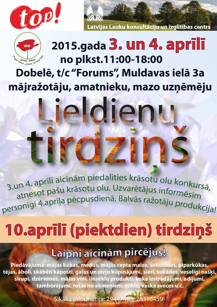 Datums: 3. Aprīlis, 2015 līdz 10. Aprīlis, 2015Reģions: ZemgaleVieta: Top! veikalsAdrese: Skatīt karti lielākā izmērā Reģions filtram: Dobeles novads