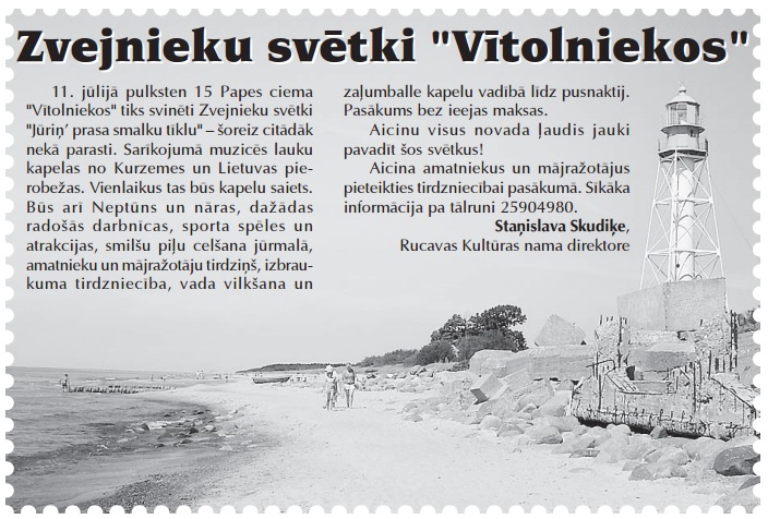 Sīkāka informācija pa tālr. 25904980; mājas lapa: www.rucava.lv.
